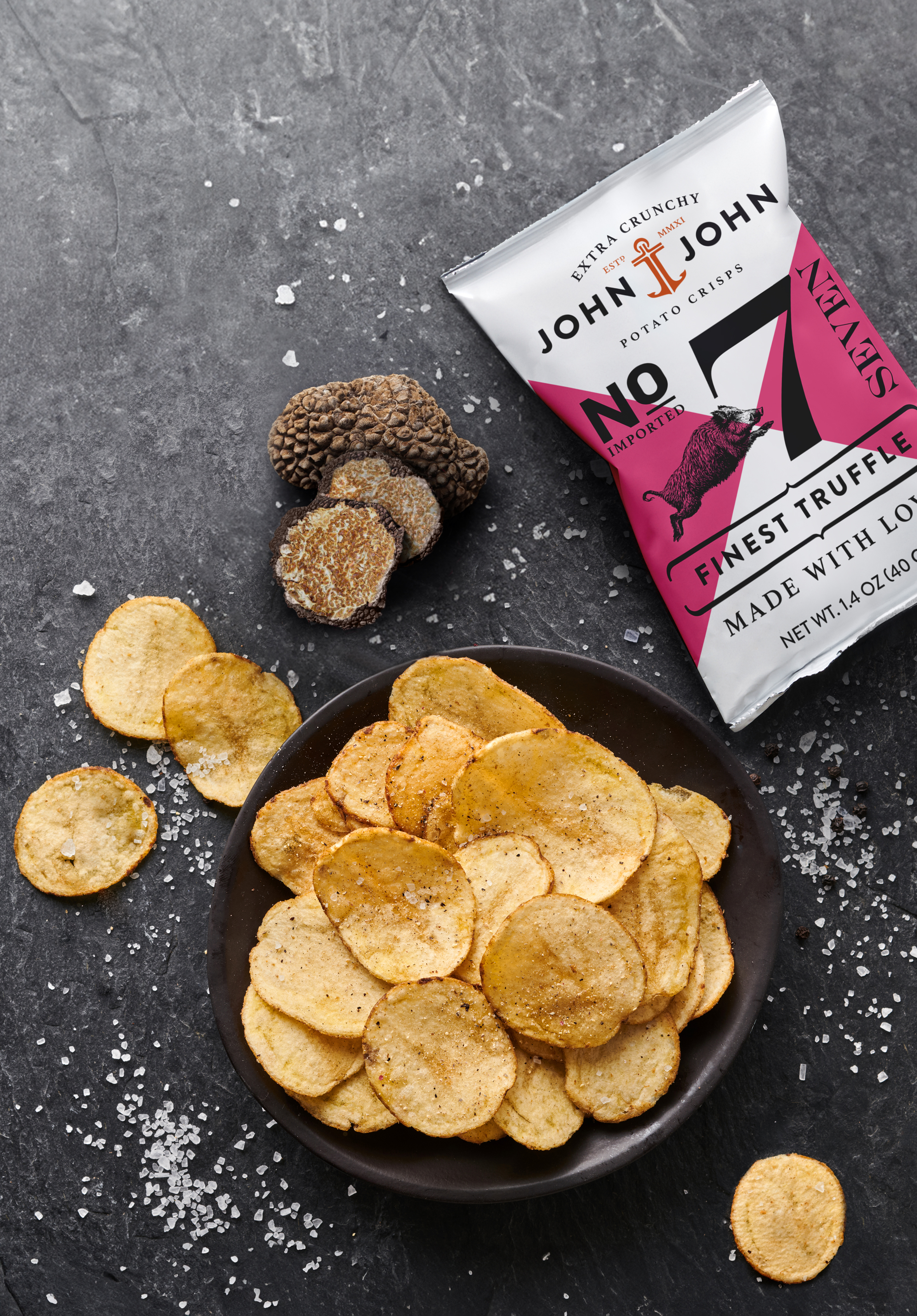 Die Marke John & John steht für handgemachte Kesselchips aus qualitativ hochwertigen Kartoffeln und edlen Gewürzen. Mit „Finest Truffle“ kommt nun die siebte Sorte in den Handel. Die knusprigen Crisps sind mit hochwertigem Trüffel und purem, feinem Meersalz verfeinert und ein außergewöhnlicher Genuss für Liebhaber von edlen Knabbereien.